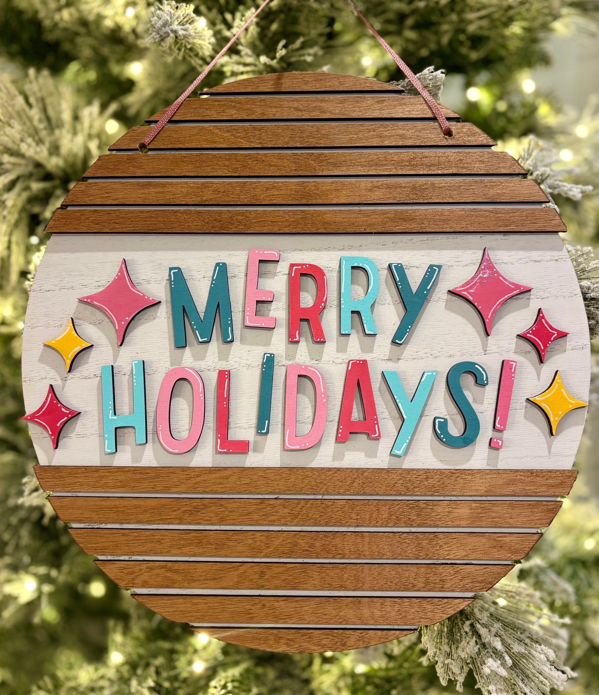 Merry Holidays Retro 12 inch door round with wood slat styles and fun colors brings timeless seasonal charm to your entryway. This expertly crafted piece combines classic retro aesthetics with durable construction, featuring authentic wood slat detailing that adds texture and visual interest. The vibrant holiday palette works seamlessly with both traditional and contemporary décor, making it a versatile choice for any home. Perfect for creating an inviting first impression, this decorative round complements wreaths, garlands, and other seasonal displays while maintaining its appeal year after year. An ideal accent for front doors, porches, or interior spaces seeking festive character.