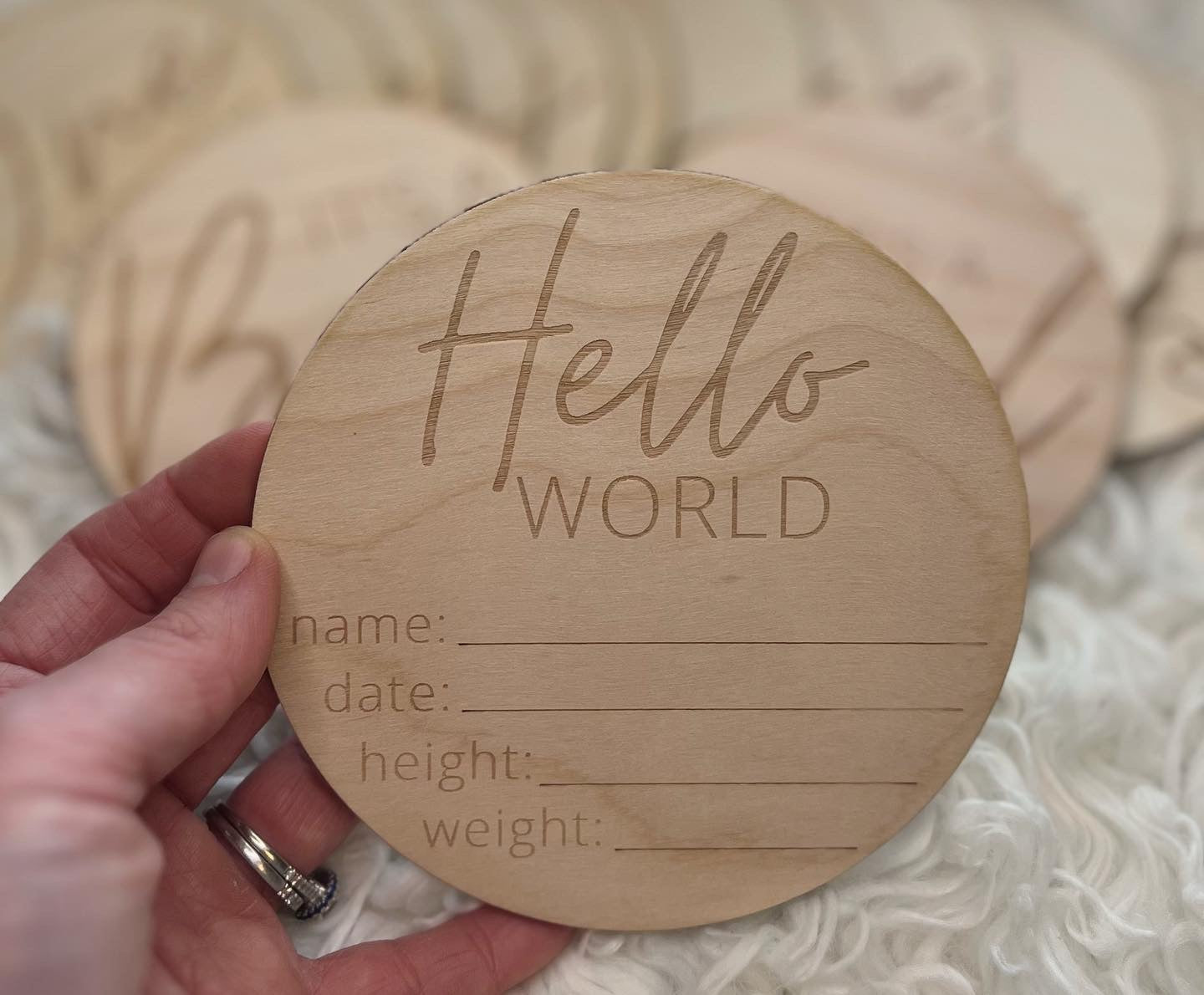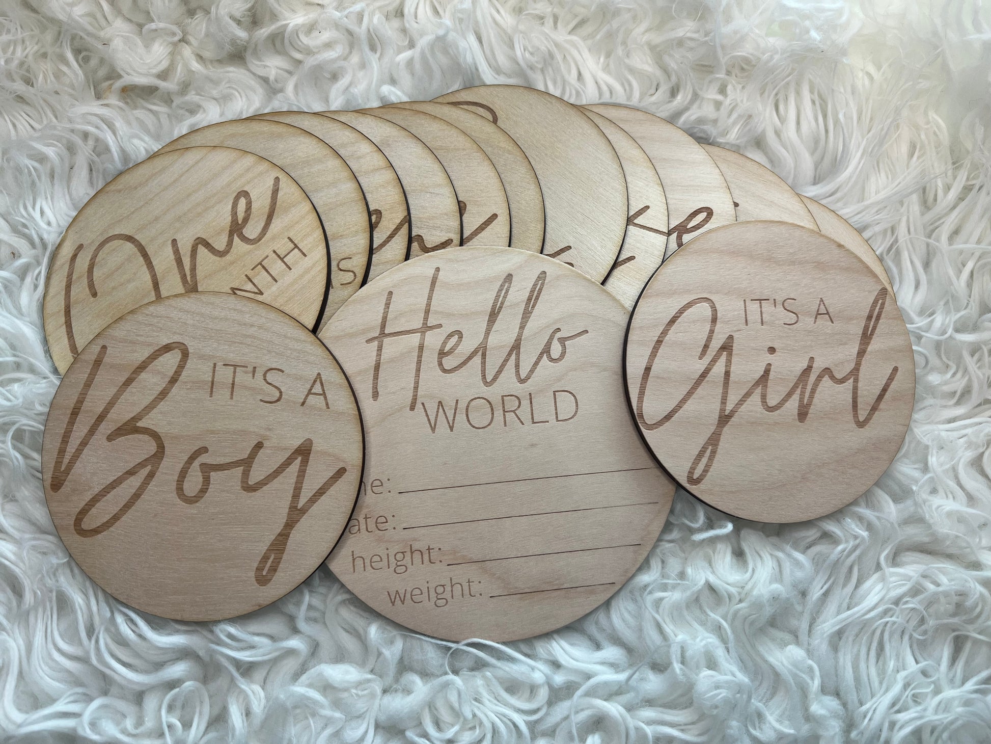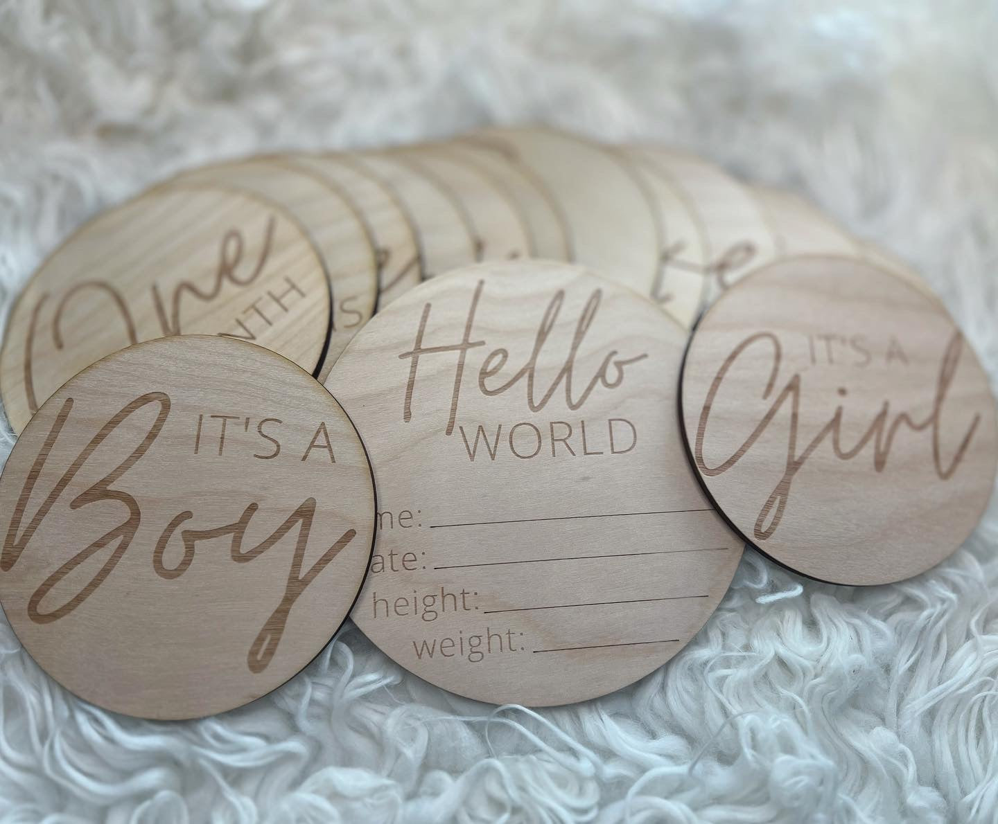 15 piece milestone round gender neutral with birth announcement. Months and genders are 4 inch engraved on 1/8 inch birch wood. Birth announcement is 5 inches.